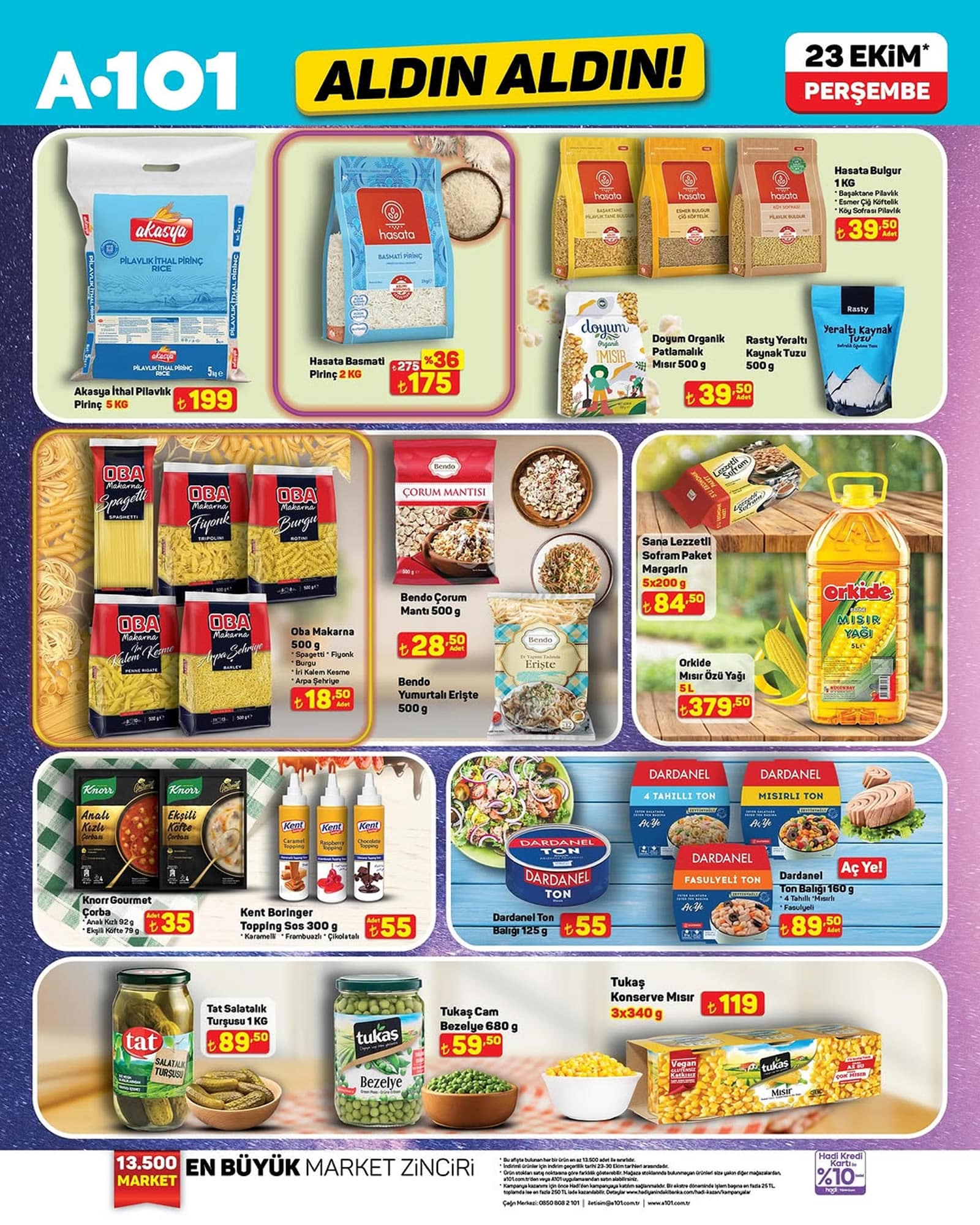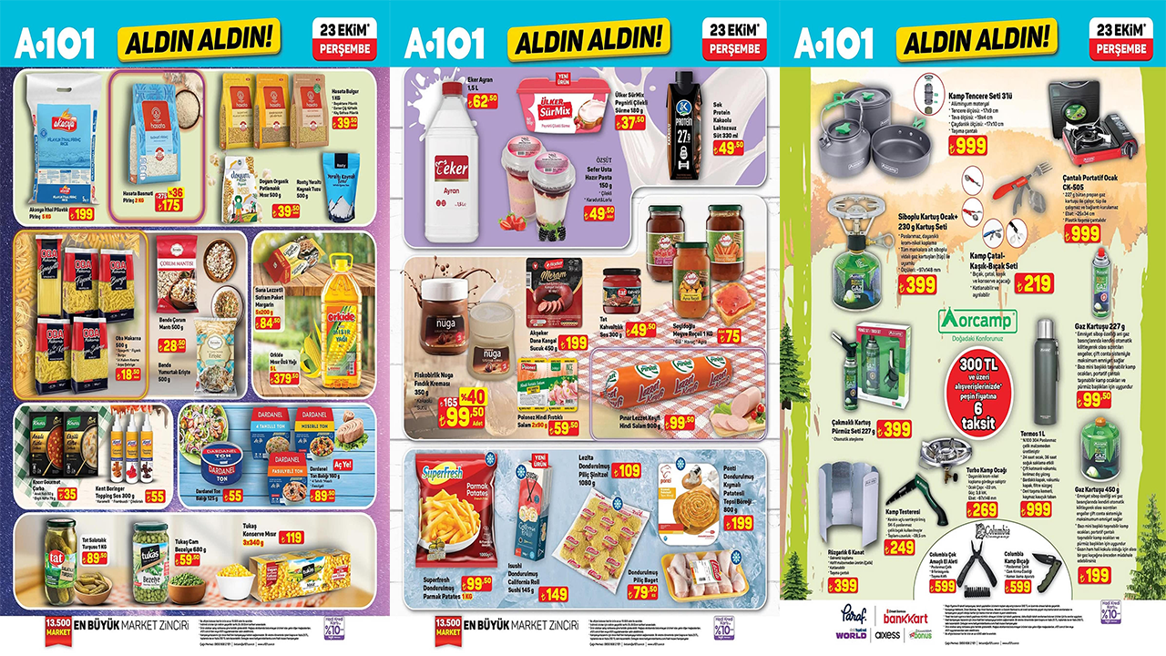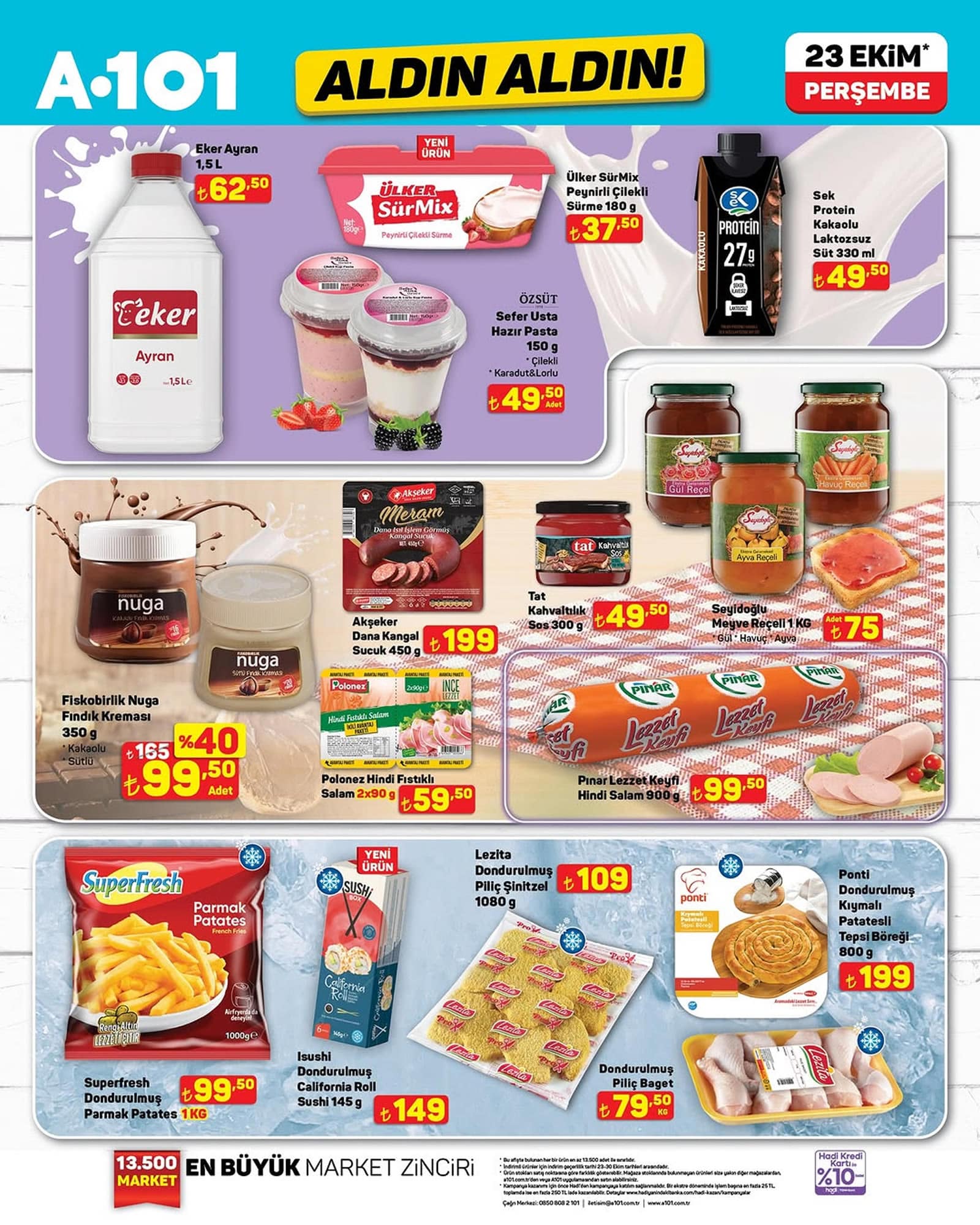 Dondurulmuş kıymalı patatesli tepsi böreği, dondurulmuş parmak patates, fındık kreması, dana kangal sucuk, hindi fıstıklı salam, kahvaltılık sos, meyve reçeli, ayran, hazır pasta, peynirli çilekli sürme, laktozsuz süt, salatalık turşusu, ton balığı, makarna, yumurtalı erişte ve bulgur gibi ürünlerin yer aldığı 23 Ekim tarihinden itibaren geçerli olacak A101 kataloğu yayınlandı.