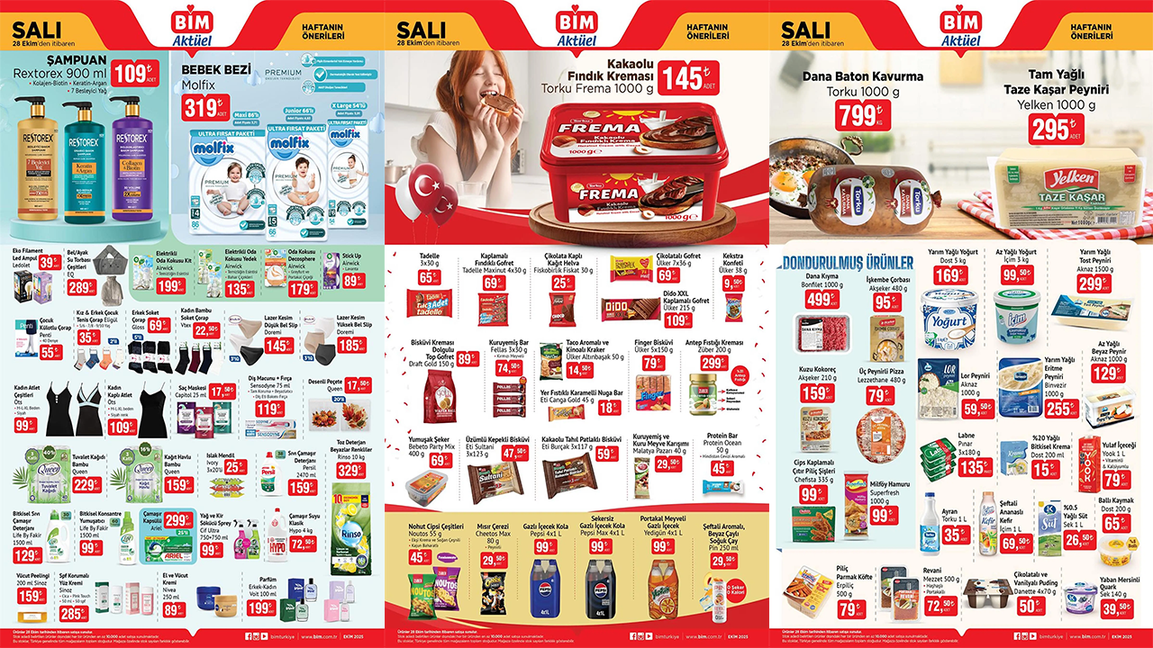Dana baton kavurma, tam yağlı taze kaşar peyniri, dana kıyma, işkembe çorbası, yarım yağlı yoğurt, az yağlı yoğurt, yarım yağlı tost peyniri, lor peyniri, labne, kuzu kokoreç, ayran, ballı kaymak ve piliç parmak köfte gibi ürünlerin yer aldığı 28 Ekim tarihinden itibaren geçerli olacak BİM kataloğu yayınlandı.