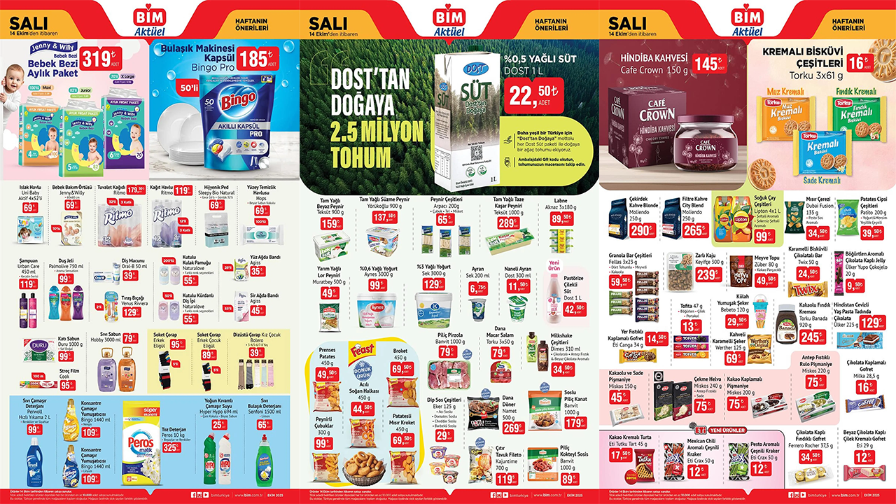 Dip sos çeşitleri, piliç pirzola, dana macar salam, pastörize çilekli süt, naneli ayran, yoğurt, yarım yağlı lor peyniri, tam yağlı taze kaşar peyniri, labne, süt, toz deterjan, çamaşır suyu ve bulaşık deterjanı gibi ürünlerin yer aldığı 14 Ekim tarihinden itibaren geçerli olacak BİM kataloğu yayınlandı.