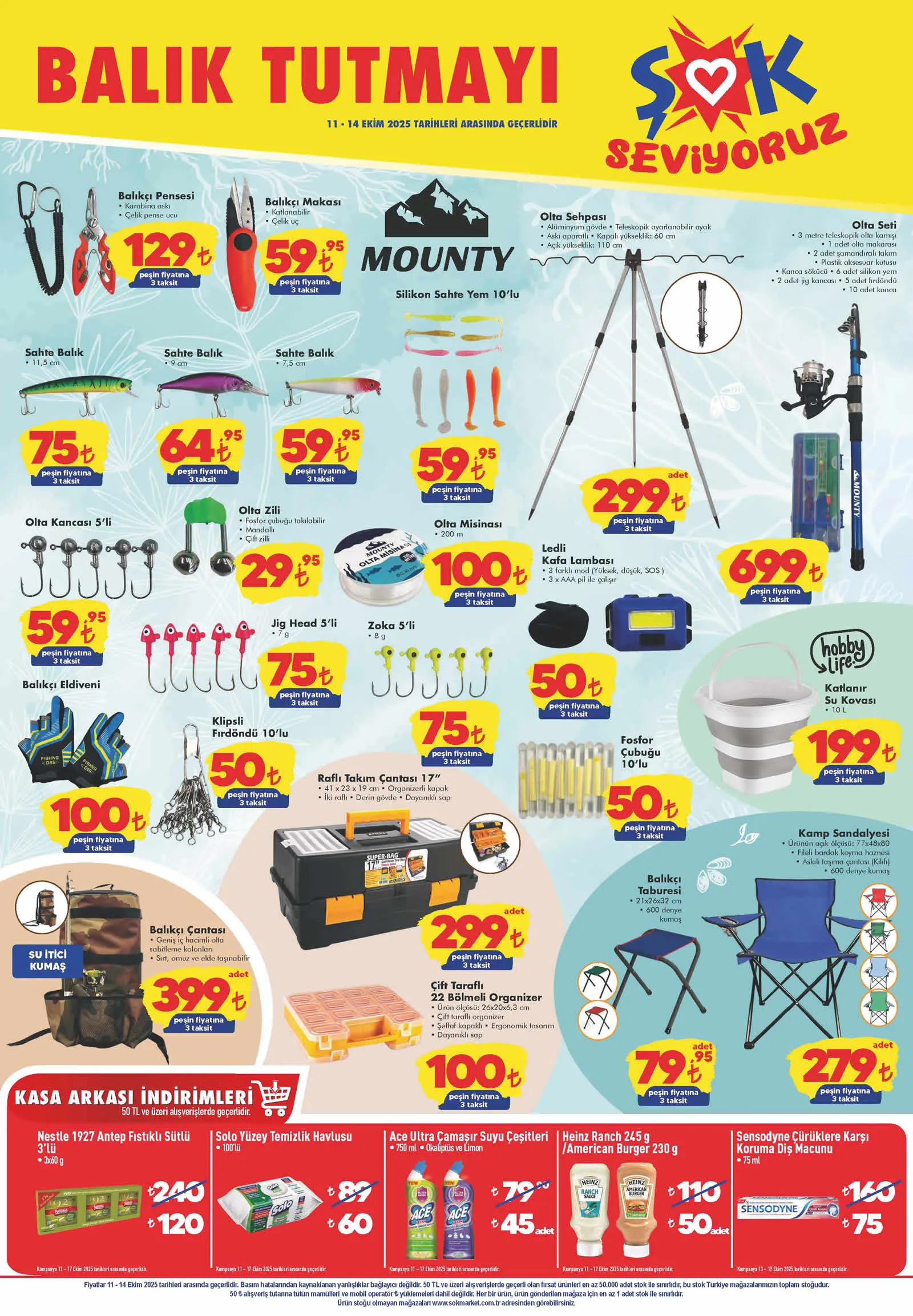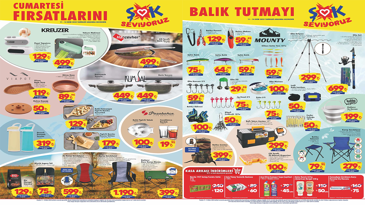 Güveç balık tava, dolma kapağı, güveç kase, karnıyarık tencere, çift taraflı balık tavası, desenli pompalı termos, mangal kömürü, bardak, olta sehpası, kafa lambası, yüzey temizlik havlusu ve çamaşır suyu gibi ürünlerin yer aldığı 11 Ekim tarihinden itibaren geçerli olacak ŞOK kataloğu yayınlandı.